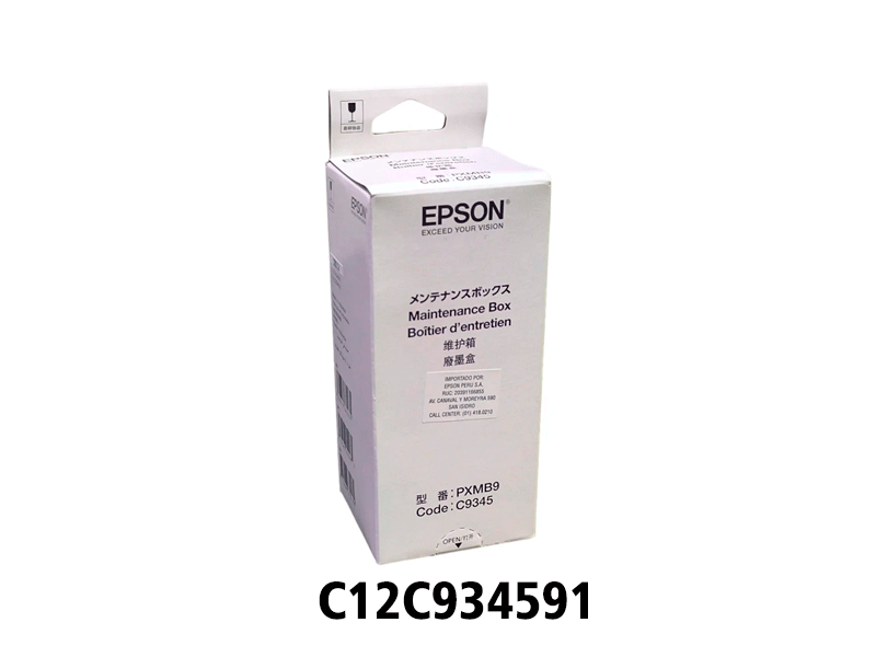 Reemplaza la caja de mantenimiento Epson C9345 (C12C934591) cuando la impresora lo indique, para evitar interrupciones en el funcionamiento. Utiliza únicamente consumibles originales Epson para asegurar un rendimiento óptimo y proteger tu equipo. No retires ni abras la caja manualmente. Desecha la unidad usada según las normas locales de residuos electrónicos.