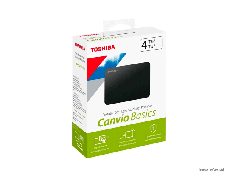 El disco duro externo Toshiba Canvio Basics 4TB ofrece gran capacidad de almacenamiento para guardar archivos, documentos, fotos, videos y copias de seguridad. Gracias a su interfaz USB 3.0, permite transferencias rápidas y eficientes, mejorando la experiencia de uso.