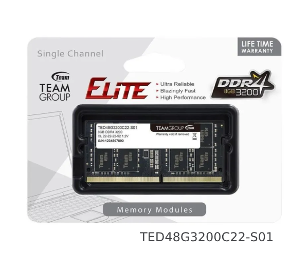 La Team Group Elite 8GB DDR4 3200MHz SODIMM (TED48G3200C22-S01) es una memoria de alto rendimiento diseñada especialmente para laptops y equipos compactos. Con una velocidad de 3200MHz y formato SODIMM DDR4, ofrece un rendimiento rápido, estable y eficiente para multitareas, navegación, ofimática y productividad general.