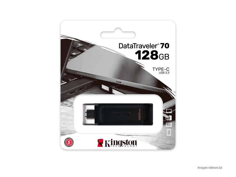 La memoria USB-C Kingston DT70 128GB ofrece almacenamiento rapido y confiable con tecnologia USB 3.2, ideal para transferir archivos de gran tamaño en segundos. Su diseño compacto y moderno con conector USB Tipo-C la hace perfecta para laptops, smartphones y tablets compatibles. Es una solucion practica para llevar documentos, fotos, videos y archivos multimedia a cualquier lugar.