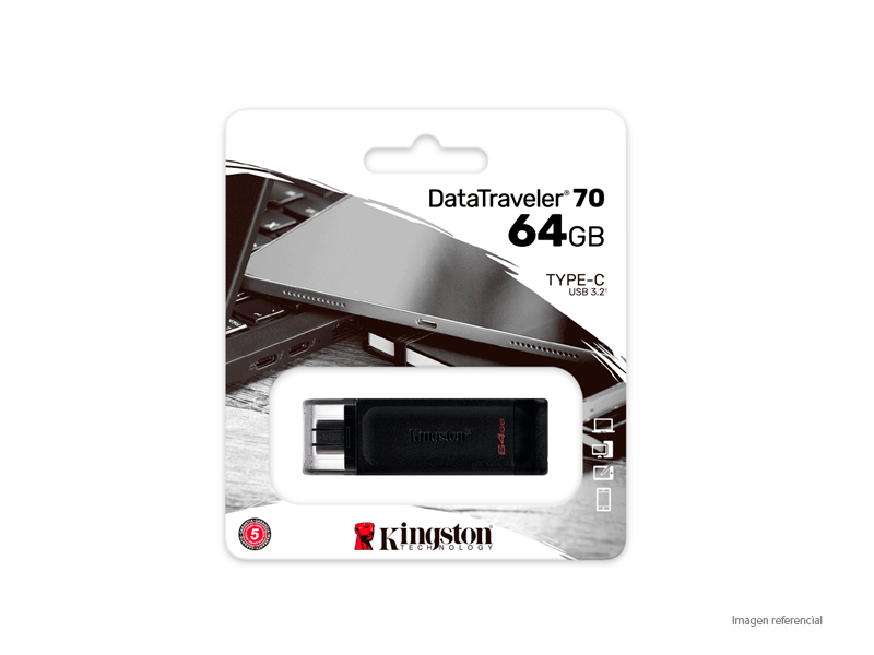 Almacena y transfiere tus archivos de forma rápida con la memoria USB Kingston DataTraveler 70 de 64GB, diseñada con conector USB-C para dispositivos modernos como laptops, tablets y smartphones.