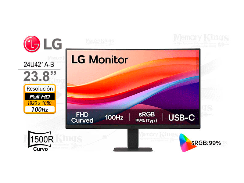 El LG 24U421A-B es un monitor curvo de 23.8 pulgadas diseñado para ofrecer una experiencia visual envolvente y cómoda, tanto para el trabajo como para el entretenimiento. Su curvatura 1500R ayuda a reducir la fatiga visual y mejora la inmersión al alinear naturalmente el campo de visión del usuario.