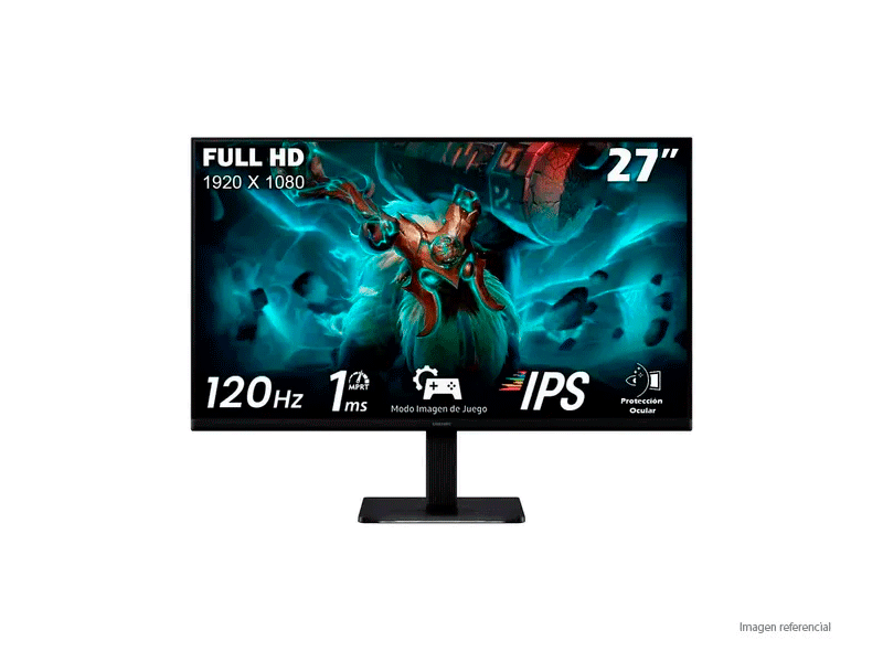 Disfruta de una experiencia visual clara y fluida con el monitor Samsung de 27 pulgadas, equipado con panel IPS, resolucion Full HD y tasa de refresco de 120Hz para imagenes mas suaves. Ideal para trabajo, entretenimiento y uso diario, ofrece colores vivos, amplios angulos de vision y un rendimiento constante.