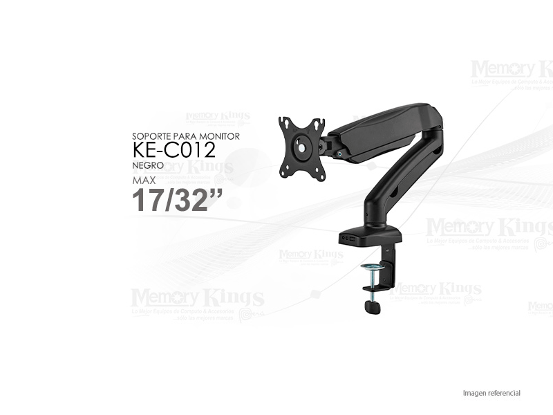 El Soporte Hidráulico de Escritorio KE-C012 está diseñado para brindar comodidad, ergonomía y optimización del espacio en tu área de trabajo. Compatible con monitores de 17 a 32 pulgadas, permite ajustar fácilmente la altura, inclinación y posición para una mejor experiencia de uso.