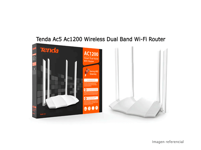 El router inalámbrico Tenda AC5 ofrece conexión estable y de alta velocidad para el hogar u oficina, gracias a su tecnología AC1200 doble banda que permite navegar, ver streaming y jugar sin interrupciones. Cuenta con velocidades de hasta 867 Mbps en 5GHz y 300 Mbps en 2.4GHz, antenas de alta potencia para mayor cobertura, puertos Ethernet para conexiones cableadas y gestión sencilla para controlar la red. Ideal para múltiples dispositivos conectados al mismo tiempo. Disponible en Lima, Perú, con garantía.