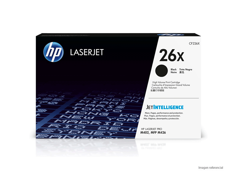 El Toner HP 26X CF226X Negro ofrece impresiones de alta calidad con textos nítidos y negros intensos, ideal para entornos de oficina con alto volumen de impresión.