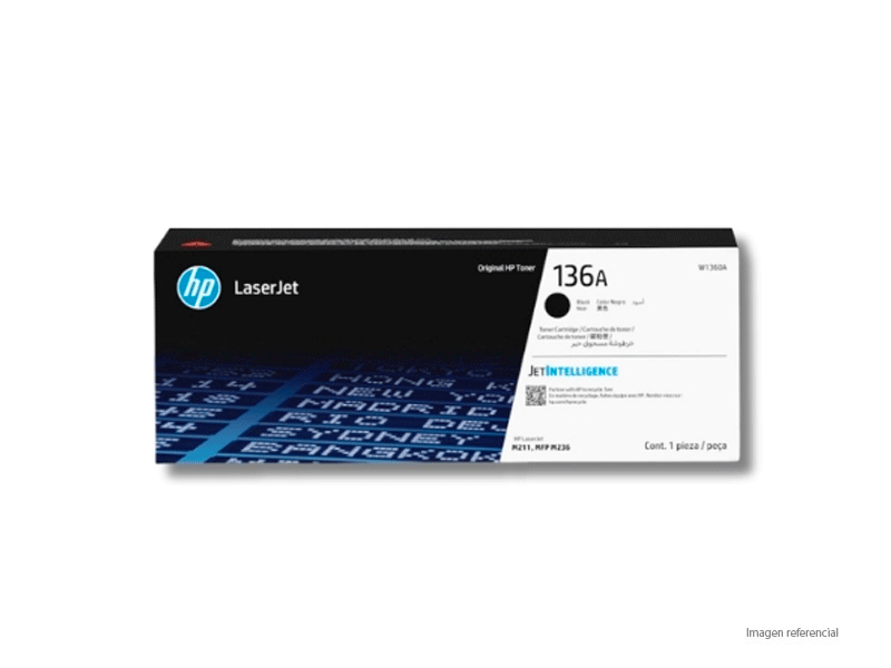Cartucho de Tóner HP 136A Negro LaserJet Original (W1360A) Los cartuchos de tóner original HP con JetIntelligence permiten imprimir textos y gráficos en color negro nítido, con opciones de alto rendimiento, con tecnología innovadora contra fraude y seguridad en el chip del cartucho. y ademas Reduzca el desperdicio mediante el reciclaje de los cartuchos originales HP.