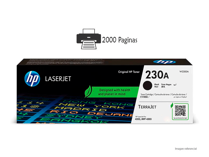El empaque y los cartuchos de tóner HP TerraJet W2300W 230A Negro, que constituyen la última generación de tecnología de cartucho y tóner HP, se rediseñaron para causar menor impacto ambiental, usar el tóner de manera eficiente para generar menos desperdicios y obtener calidad destacada de impresión con seguridad integrada.