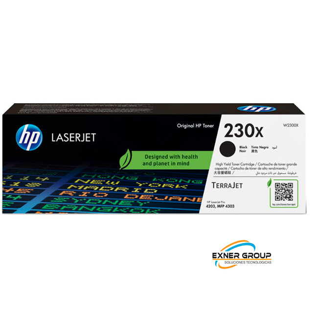 El empaque y los cartuchos de tóner HP TerraJet W2300X 230x Negro, que constituyen la última generación de tecnología de cartucho y tóner HP, se rediseñaron para causar menor impacto ambiental, usar el tóner de manera eficiente para generar menos desperdicios y obtener calidad destacada de impresión con seguridad integrada.