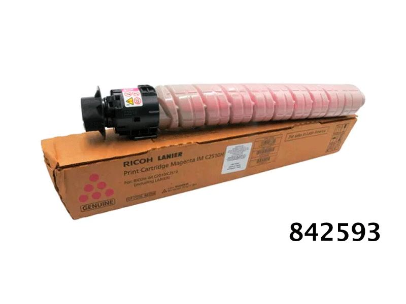 Tóner original Ricoh 842593 negro, diseñado para las impresoras multifunción Ricoh IM C2010, IM C2510 y IM C2510H. Este cartucho de alta capacidad permite imprimir hasta 18,000 páginas con calidad profesional, ofreciendo negros profundos y textos nítidos en cada impresión.